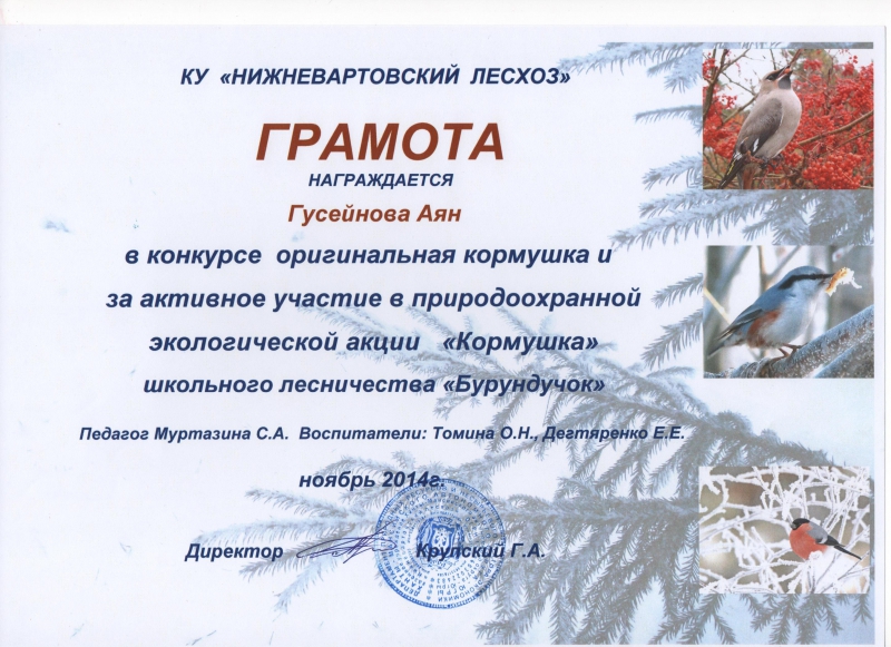 Грамота экологической акции "Кормушка". Гусейнова Аян.